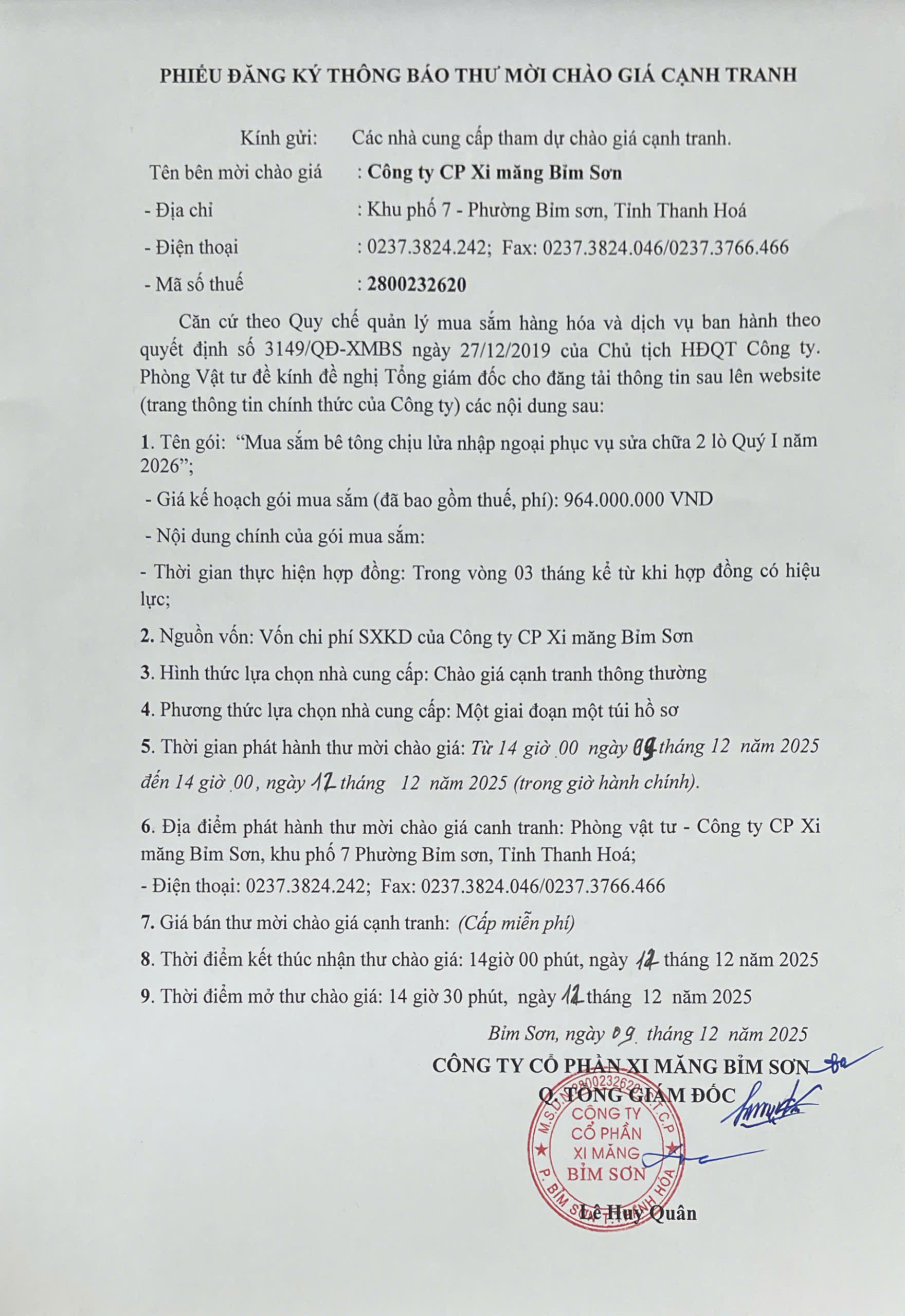 Phiếu đăng ký thông báo thư mời chào giá cạnh tranh gói: “Mua sắm bê tông chịu lửa nhập ngoại phục vụ sửa chữa 2 lò Quý I năm 2026”