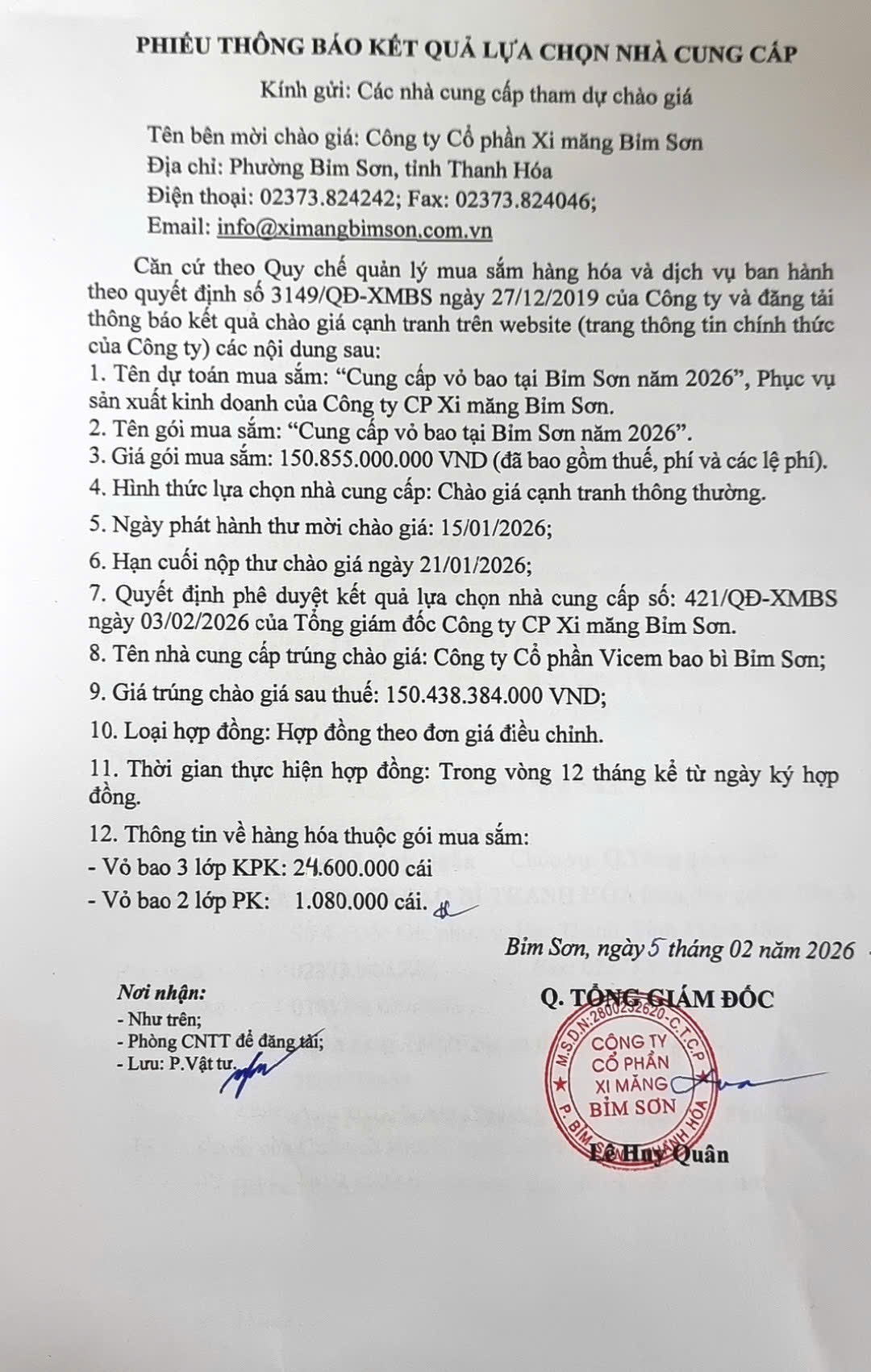 Thông báo kết quả lựa chọn nhà cung cấp: “Cung cấp vỏ bao tại Bỉm Sơn năm 2026”