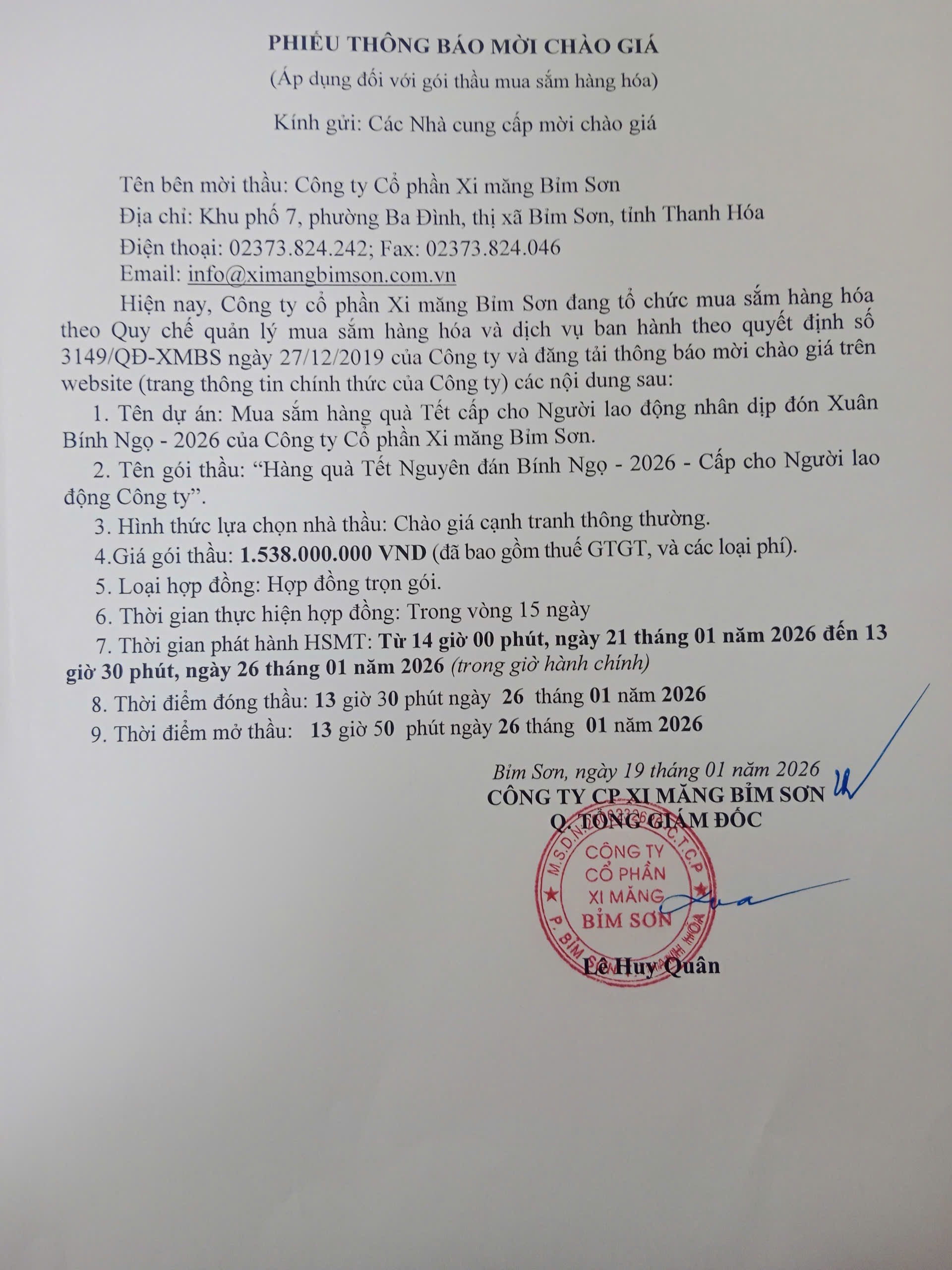 Thông báo mời chào giá gói mua sắm: “Cung cấp vỏ bao tại Bỉm Sơn năm 2026”