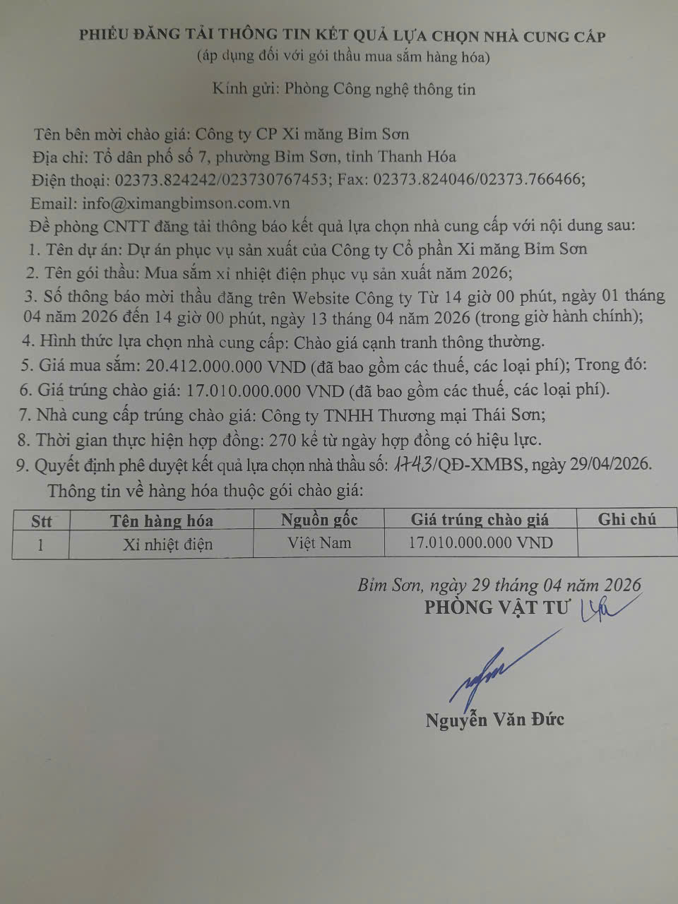 Thông tin mua sắmThông tin kết quả lựa chọn nhà cung cấp gói thầu: “Mua sắm xỉ nhiệt điện phục vụ sản xuất năm 2026” Cập nhật: 29/04/2026